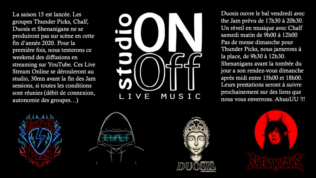 Articles La saison 15 est lancée La saison 15 est lancée Live Stream Online au studio pour remplacer le premier concert programmé le vendredi 11 Décembre. Covid oblige !!! Partager : Cliquer pour partager sur X(ouvre dans une nouvelle fenêtre) X Cliquez pour partager sur Facebook(ouvre dans une nouvelle fenêtre) Facebook J’aime chargement…
