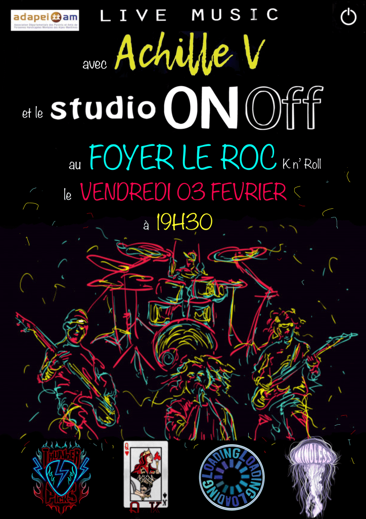 Le studio ON/OFF jouera vendredi 03 février 2023 pour les résidents du foyer le Roc. Une belle soirée en perspective avec les groupes Thunder Picks, QnK, Loading et Mindless ainsi que notre invité Parisien, Achille V.
